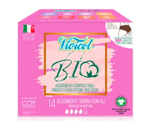 Szerokość: 7 cm, Chłonność: 4/5. Podpaski chłonne z serii VIVICOT BIO są produkowane z wyselekcjonowanych surowców i certyfikowane jako organiczne. Ani w czasie wzrostu bawełny i jej zbiorów, ani na żadnym etapie produkcji podpasek nie dochodzi do ich kontaktu z chemikaliami. Dzięki temu BIO-bawełna pozostaje biała, czysta i nieskazitelna. W produkcji została poddana jedynie działaniu nadtlenku wodoru (woda utleniona). Brak środków wybielających takich jak chlor i inne agresywne wybielacze gwarantuje, że włókna podpasek są hipoalergiczne. Oznacza to, że ich kontakt ze skórą nie powoduje alergii, podrażnień i zapalenia skóry. Tak pozyskana i przetworzona bawełna zachowuje maksymalną absorbcję oraz naturalnąmiękkość i delikatność. Seria produktów VIVICOT BIO - to pierwsze włoskie podpaski higieniczne, które są całkowicie biodegradowalne i kompostowalne. To bardzo etyczne produkty, które pozwalają zmniejszyć ilość odpadów i zwiększyć wykorzystanie produktów odnawialnych. Podpaski są nie tylko biodegradowalne, ale też w pełni kompostowalne, również w warunkach domowych. Oznacza to, że mogą być po użyciu umieszczone w domowym kompostowniku. To samo dotyczy owijki, która wyglądem przypomiana folię, a w rzeczywistości została wykonana ze skrobi kukurydzianej. Pudełko kartonowe pochodzi z recyklingu i nadaje się do ponownego przetworzenia.