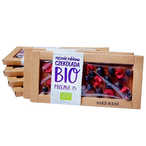 czekolada mleczna* (cukier trzcinowy*, tłuszcz kakaowy*, MLEKO pełne w proszku*, miazga kakaowa*, emulgator: lecytyny (z SOI *), czarna porzeczka liofilizowana* (1,4 %), malina liofilizowana* (1,4 %) (*certyfikowany składnik ekologiczny) Masa kakaowa minimum 38,8 %.