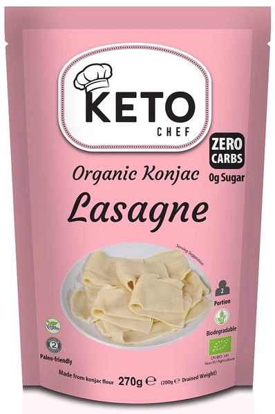 Makaro Konjac Lasagne od Keto Chef wyprodukowany jest z korzenia konjac. Jest bez glutenu i cukru. Nie zawiera węglowodanów, dzięki czemu jest doskonały dla osób będących na diecie keto.