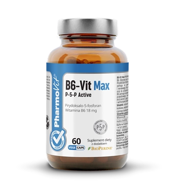 B6-Vit Max P-5-P Active uzupełnia zapotrzebowanie organizmu na witaminę B6. Odgrywa ona znaczącą rolę w prawidłowym funkcjonowaniu organizmu. Pirydoksalo-5-fosforan, czyli aktywna, biodostępna forma witaminy B6 pomaga w prawidłowym funkcjonowaniu układu odpornościowego i nerwowego. Przyczynia się do zmniejszenia uczucia zmęczenia i znużenia oraz do utrzymania prawidłowego metabolizmu energetycznego. Witamina B6 pomaga w prawidłowej produkcji czerwonych krwinek oraz w utrzymaniu prawidłowego metabolizmu homocysteiny. Skład wzbogacony został ekstraktem z pieprzu czarnego BioPerine®. Pieprz czarny wspiera trawienie i wchłanianie składników odżywczych.