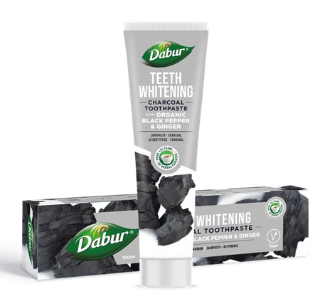 Pasta do zębów Dabur z węglem, czarnym pieprzem i imbirem wykorzystuje moc wybielania węgla, aby usunąć przebarwienia, pozostawiając olśniewająco biały uśmiech.