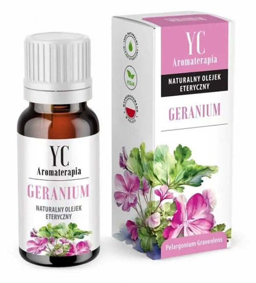 - Olejek geranium ma świeży zapach. Działa antyseptycznie, łagodzi przeziębienia, stres, skurcze menstruacyjne, a także wspiera leczenie infekcji.