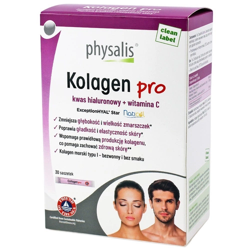 Physalis Collagen Pro to rozpuszczalna mieszanina kolagenu, witaminy C i kwasu hialuronowego. Kolagen jest białkiem, który wchodzi w skład tkanki łącznej skóry, stawów, więzadeł, ścięgien i kości. Dodana witamina C pomaga w prawidłowym tworzeniu kolagenu, aby zachować zdrową skórę. Naticol® to wysoce czysta forma kolagenu typu I pozyskiwana z RYB, której działanie zostało potwierdzone różnymi badaniami klinicznymi. Jest wytwarzany w unikalnym procesie wykorzystującym hydrolizę enzymatyczną, w wyniku czego powstaje łatwo wchłanialna mieszanina krótkich peptydów. ExceptionHyal®Star to kompleks kwasu hialuronowego o pełnym spektrum działania, zawierający szereg rodzajów kwasu hialuronowego o różnej długości, które działają synergistycznie. Wykazano, że ExceptionHyal®Star zmniejsza głębokość i rozmiar zmarszczek oraz poprawia gładkość i elastyczność skóry.