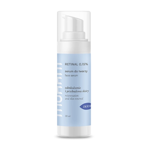 Serum Anti-Aging ze stabilizowanym retinalem 0,15 %. Odmłodzenie i przebudowa skóry. Stworzone z myślą o skórze potrzebującej odmłodzenia i przywrócenia jędrności. Dzięki zawartości Retinalu w stężeniu 0,15 % - najefektywniejszej formie pochodnej witaminy A - Twoja skóra zostanie pobudzona do produkcji kolagenu i elastyny, co przyczyni się do wygładzenia zmarszczek i uregulowania produkcji sebum.