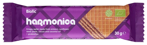Wafel Probiotyczny+ od Bułgarskiego producenta Harmonica wytwarzany jest z mąki orkiszowej pełnoziarnistej oraz wzbogacony o probiotyki, które działają korzystnie na przewód pokarmowy. Pyszny ekologiczny wafel o smaku czekoladowo orzechowym może być świetną alternatywą dla standardowych wafli dostępnych w marketach.