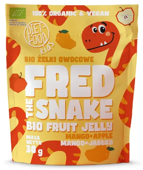 Nasze żelki są wykonane ze 100% ekologicznych owoców z certyfikowanych sadów, są w pełni wegańskie i pozbawione sztucznych aromatów, barwników, konserwantów oraz polepszaczy smaku. W żelkach „Fred The Snake” znajdziesz jedynie naturalne cukry pochodzące z owoców - bez dodatku białego cukru i syropu glukozowo-fruktozowego. Dzięki poręcznemu opakowaniu te kolorowe, owocowe żelki można łatwo zapakować do plecaka lub lunchboxa. Wybierając żelki „Fred The Snake”, dajesz swojemu dziecku zdrową i smaczną przekąskę, która z pewnością stanie się ulubionym przysmakiem każdego małego łasucha!