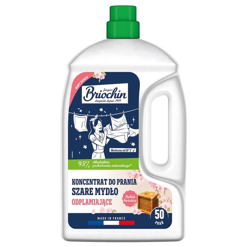 Koncentrat do prania Briochin na bazie szarego mydła to ekologiczna alternatywa dla tradycyjnych detergentów. Środek skutecznie usuwa plamy i zabrudzenia, głęboko wnikając we włókna tkanin. Jego skoncentrowana formuła pozwala na efektywne pranie, nawet w niskich temperaturach, co przekłada się na oszczędność energii. Skuteczny od temperatury 20 stopni Celsjusza. Koncentrat wystarcza na 50 prań.