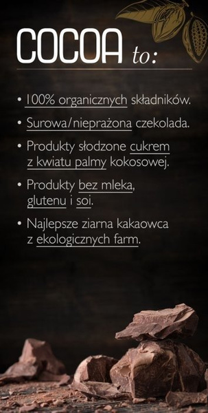 Sama czekolada wytworzona jest z nieprażonych ziaren kakaowca. Zawiera łatwo przyswajalny magnez, potas i żelazo. Kupując u nas masz pewność, że ten produkt posiada znak rolnictwa ekologicznego