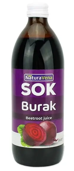Sok z buraka polskiego o intensywnej czerwonej barwie, konsystencja klarowna, o lekko słodkawym smaku.