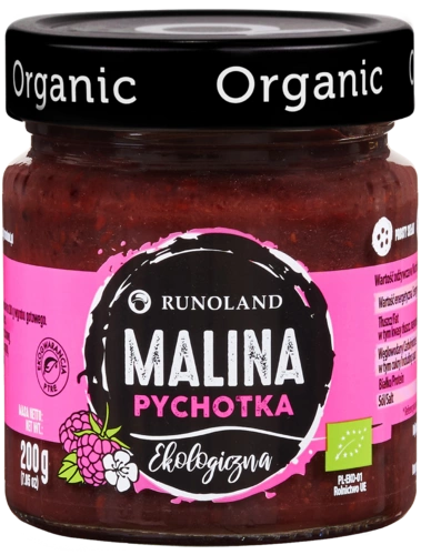 Ekologiczna Malina pychotka nie jest tak słodka jak konfitura, nie jest tak gęsta jak dżem. Zawiera bardzo wysoki udział owoców, bo aż 80%. Przyrządzona z soczystych, aromatycznych malin pochodzących z ekologicznych upraw. Idealna do deserów, lodów, ciast, pieczywa czy herbaty. To znakomita przekąska na jesienne i zimowe wieczory, która przypomni Państwu słoneczne dni lata. Sporządzono z 80 g owoców na 100 g wyrobu gotowego.